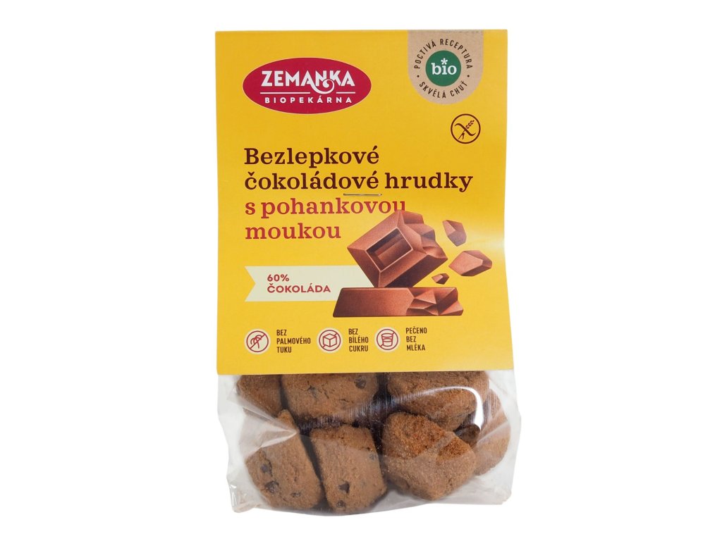BIO bezlepkové čokoládové hrudky pečou v Biopekárně Zemanka z pohankové a kukuřičné mouky. Ochucené jsou kakaem, pravou vanilkou a kousky kvalitní hořké čokolády. Nesladí se cukrem, ale přírodními sirupy z rýže a agáve.