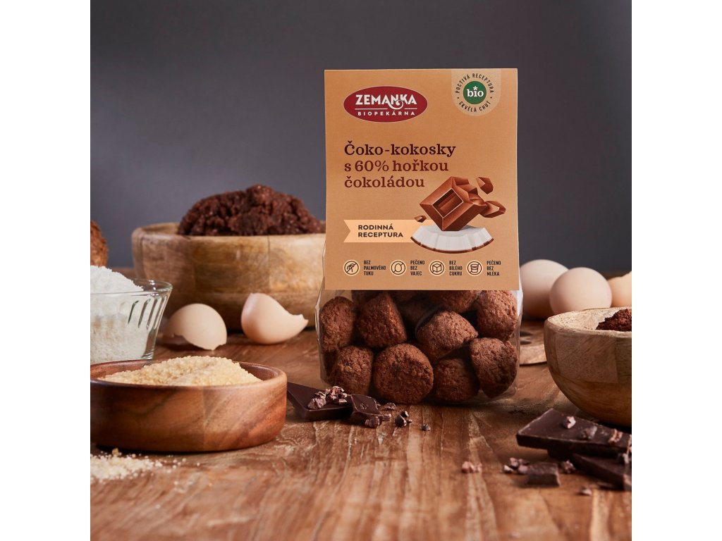 Čoko-kokosky s hořkou čokoládou byly jedním z prvních produktů Biopekárny Zemanka a stále patří mezi nejoblíbenější. Kombinace kokosu, kakaa, přírodní vanilky a kousků kvalitní čokolády se prostě nikdy neomrzí.
