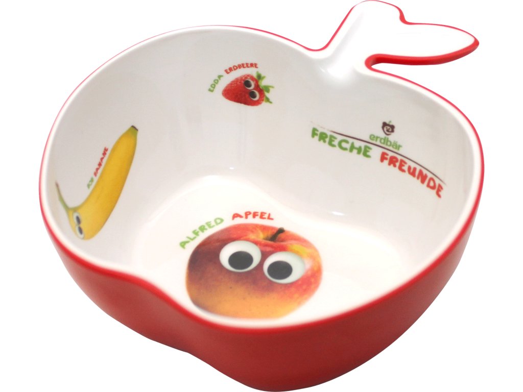 MIska ve tvaru jablíčka zaujme na první pohled. Je vyrobená z pevného kvalitního plastu a najdete na ní obrázky veselých Freche Freunde postaviček.