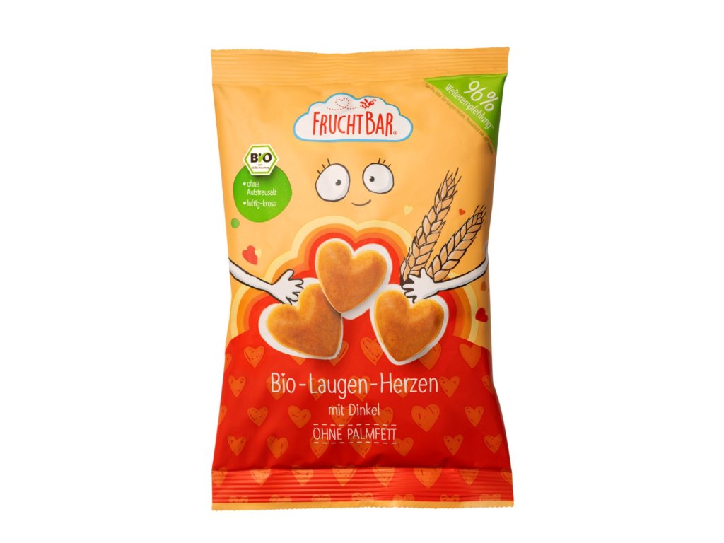 Ukaž svou lásku svačinkou. Křupavá srdíčka FruchtBar udělají radost dětem i dospělým. Základ tvoří špaldová mouka a díky louhování jsou srdíčka krásně křupavá jako preclíčky. 100% přírodní složení v BIO kvalitě.