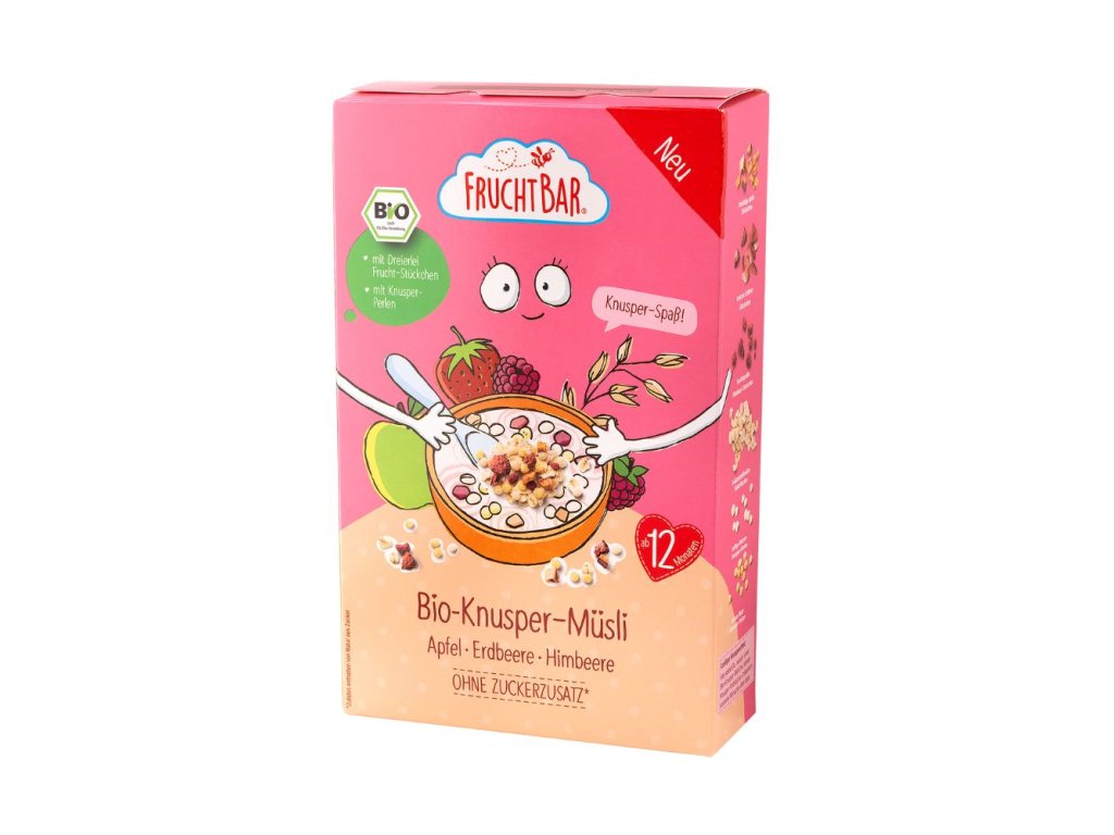 Ovocné müsli FruchtBar stačí přidat do mléka či jogurtu a snídani máte hotovou. Neobsahuje žádný přidaný cukr, ale je příjemně sladké díky sušeným banánům a jablečným kouskům. Mrazem sušené kousky malin a jahod krásně křupou a díky šetrné metodě sušení si zachovávají nejen chuť, ale i výživové hodnoty jako čerstvé plody. Vhodné pro děti od 1 roku.