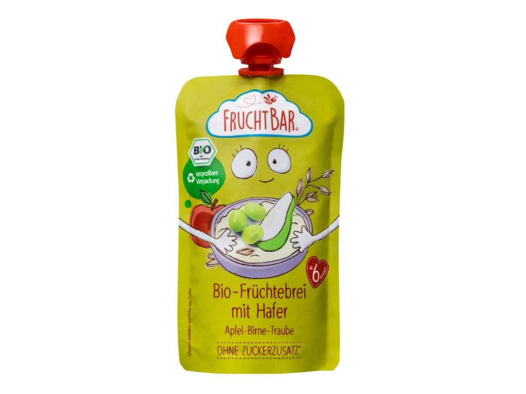 Ovocné kapsičky FruchtBar se vyrábí pouze z BIO surovin. V této kapsičce najdete jablka, hrušky, hroznovou šťávu a ovesnou mouku. Žádný přidaný cukr nebo škrob. Díky ovesné mouce kapsička zasytí na delší dobu. Je vhodná pro děti od ukončeného 6. měsíce, ale potěší i mnohem starší děti. Praktické balení se perfektně hodí na výlety, dětské hřiště, do auta či letadla. Obal je plně recyklovatelný – neobsahuje hliník, takže ho můžete celý vyhodit do tříděného kontejneru na plasty.