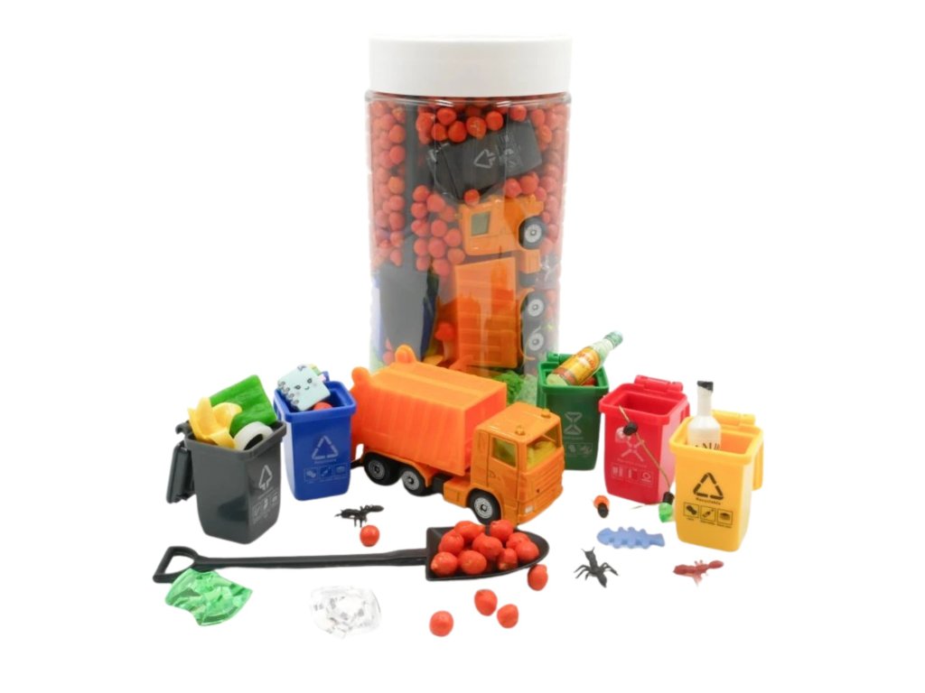 Originální tubus pomůže naplno rozvinout fantazii vašich dětí. Budou nabírat zelenou rýži, prohrabávat se oranžovou cizrnou a třídit "odpadky" do správných popelnic.