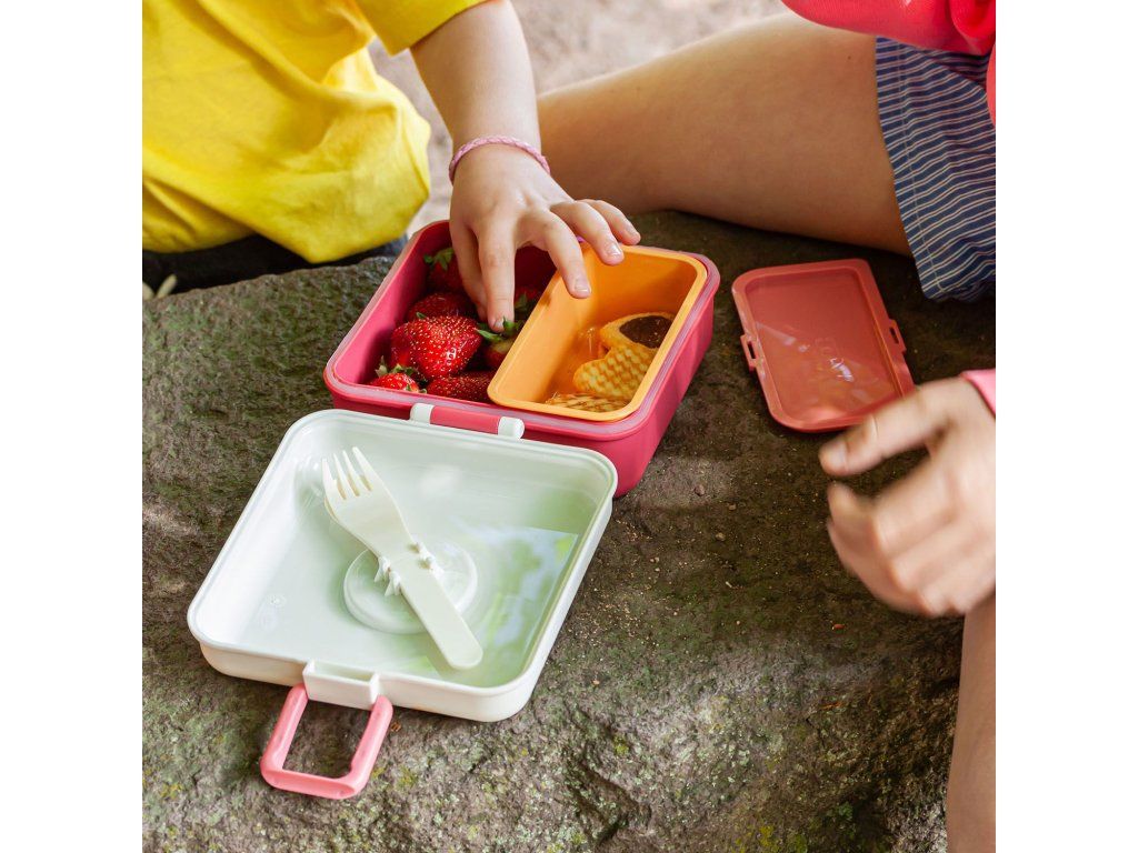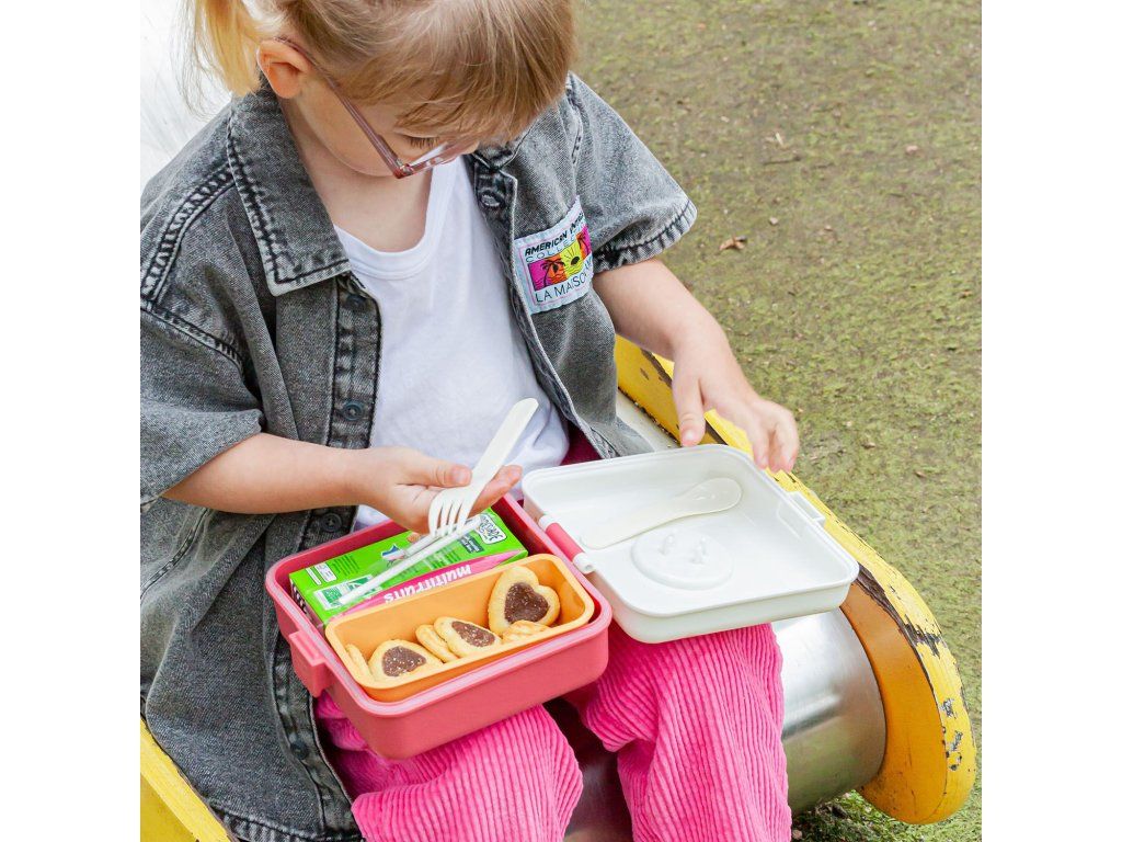 Svačinový box Monbento Snacky má snadné otevírání, které zvládnou i malé dětské ruce. Krabička je dostatečně velká, aby se do ní vešel celý sendvič. Součástí je i malá krabička s víčkem, vidlička a lžíce. Ve víku můžete měnit motivy a vytvořit si tak svůj originál. Součástí balení jsou 4 motivy, ale můžete použít třeba fotku, dětskou kresbu, vzkaz nebo jmenovku.
