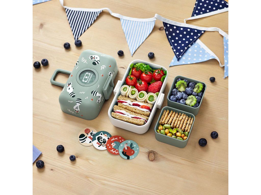 Monbento Tresor je velký box na obědy a svačiny, má snadné otevírání, které zvládnou i malé dětské ruce. Box má tři zcela samostatné krabičky - jednu velkou o objemu 500 ml a 2 malé o objemu 150 ml. Ve víku můžete měnit motivy a vytvořit si tak svůj originál. Součástí balení jsou 4 motivy, ale můžete použít třeba fotku, dětskou kresbu, vzkaz nebo jmenovku.