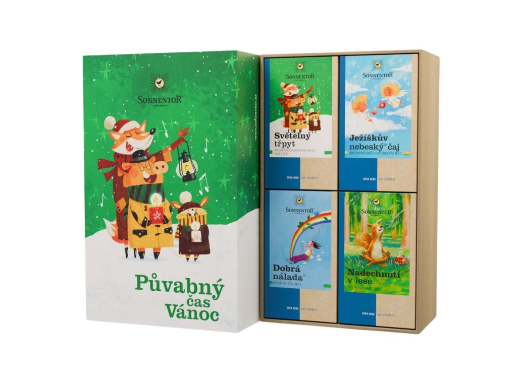 Vánoce jsou o klidu, pohodě a chvílích, které si můžeme vychutnat s těmi, na kterých nám nejvíc záleží. Dárková kazeta Půvabný čas Vánoc od Sonnentoru je ideálním dárkem pro všechny, kdo milují vůni bylinek a hřejivý šálek čaje. Kombinuje čtyři oblíbené BIO směsi – Světelný třpyt s vůní pomeranče a skořice pro večerní rozjímání, Ježíškův nebeský čaj, který přináší klid a harmonii svátečních dnů, tradiční směs Dobrá nálada pro pohodu celé rodiny a Nadechnutí v lese, které připomíná tichou procházku mezi stromy. V každém šálku najdete trochu kouzla, přírody a tepla domova – přesně to, co dělá Vánoce tak půvabné 💛
