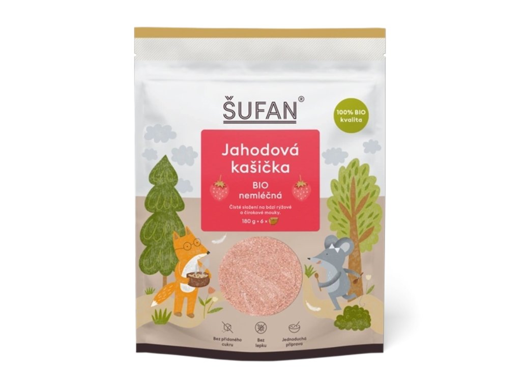 Bezlepková a bezmléčná jahodová kašička z poctivých BIO surovin. Je ochucená mrazem sušenými jahodami a krémovou strukturu ji dodává kokosové mléko. Jemná kašička značky Šufan bude vyhovovat i citlivým dětským bříškům. Obal zdobí hravé ilustrace lišáka Luba a myšičky Maji.