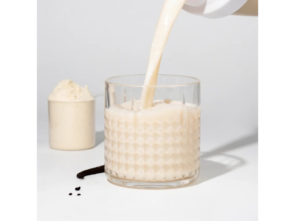 ultrafiltrovaný nedenaturovaný syrovátkový proteinový koncentrát (mléko, emulgátor: slunečnicový lecitin) (98 %), přírodní aroma, mletá vanilka 0,2 %, sladidlo: steviol‑glykosidy