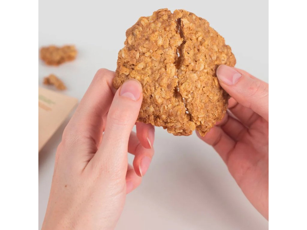 Ovesné vločky a mouka tvoří základ sušenky a dodávají komplexní sacharidy, vlákninu i minerální látky jako hořčík, mangan a fosfor. -