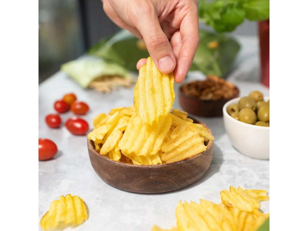 Základem jsou kvalitní brambory odrůdy Agria ze Španělska, které jsou ideální pro smažení. Chipsy se připravují šetrně na extra panenském olivovém oleji při nižší teplotě (160 - 170°C), díky čemuž si zachovávají nejen chuť, ale i lepší nutriční profil.