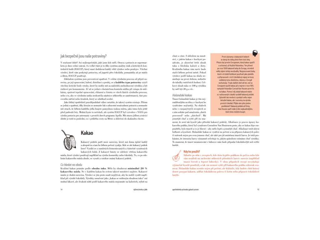 - Získáte přehledného průvodce galaxií surovin. V této části knihy najdete odpovědi na veškeré otázky, které vás kdy napadly ke kakau, kypřidlům, čokoládě, cukrům a sirupům, umělým sladidlům, mléku, máslu, sýrům a kysaným mléčným výrobkům, vejcím, masu, rybám, rostlinným potravinám pro vegany a alergiky, tukům a olejům, ořechům, mouce a pečivu, bramborám, těstovinám, luštěninám, nápojům, včetně čaje, kávy a minerálek, ale i soli.